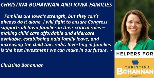 Enacting the care agenda for children requires a working majority in Congress, and the U.S. House is only a handful of votes short of having that. Christina Bohannan not only will be one of those votes if she is elected in Iowa's First Congressional district; she is a champion for this agenda (see below).